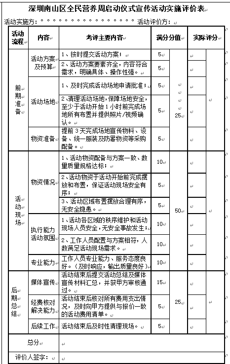 备注:1、本活动评价表满分为100分,90分及以上为优秀,80-89分为良好,低于80分为不合格;2.活动评价方对评价表内容享有最终解释权。 3.投标报价要求: (1)供应商应根据本企业的成本自行决定报价,但不得以低于其企业成本的报价,各供应商在报价时,应充分考虑报价的风险。 (2)供应商的报价,应是本项目需求范围上所列的各项内容中所述的全部,以供应商在提出的综合单价或总价为依据,供应商不得期望通过索赔等方式获取补偿。 (3)供应商的报价不得超过最高限价。如有以下异常低价情形,供应商仍需提供项目具体成本测算等与报价合理性相关的书面说明及必要的证明材料,包括但不限于原材料成本、人工成本、制造费用等。 a.投标(响应)报价低于全部通过符合性审查供应商投标(响应)报价平均值50%的,即投标(响应)报价<全部通过符合性审查供应商投标(响应)报价平均值×50%; b.投标(响应)报价低于通过符合性审查的次低报价供应商投标(响应)报价50%的,即投标(响应)报价<通过符合性审查的次低报价供应商投标(响应)报价×50%; c.投标(响应)报价低于采购项目最高限价45%的,即投标(响应)报价<采购项目最高限价×45%; d.评审小组基于专业判断,认为供应商报价过低,有可能影响产品质量或者不能诚信履约的其他情形。 4.付款方式: (1)按合同价支付,供应商完成服务内容并通过采购方验收后,在提供有效发票10个工作日内,采购方向供应商支付合同全部费用金额。 (2)供应商未按采购方要求提供相应金额合法有效的税务发票的,采购方有权拒付,并不因此承担违约责任。因受财政拨款程序控制,采购方完成各项支付手续报财政审批即视为完成了相应的付款义务,审批导致支付时间延长时,不视为采购方违约,供应商仍应按合同约定履行义务。 | |||